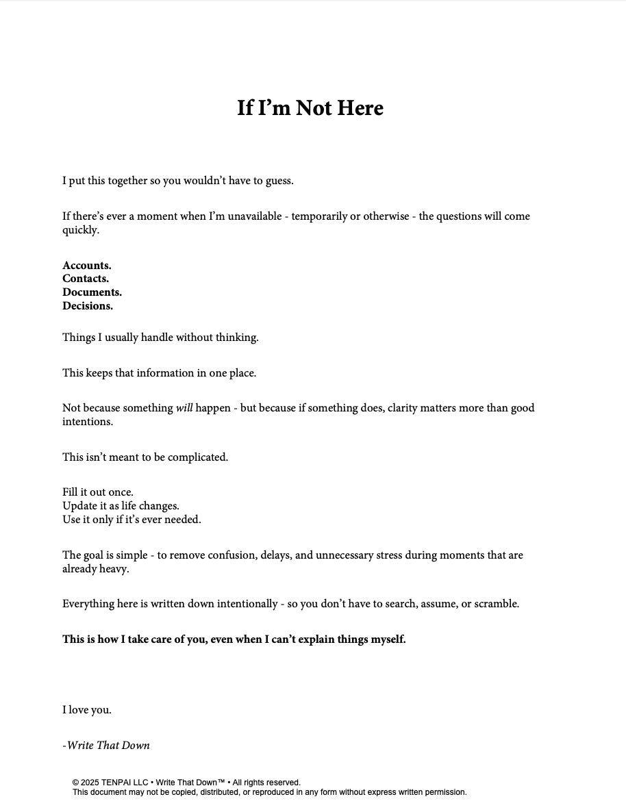 If I’m Not Here is a fillable digital file designed to organize the information your family will immediately need if you’re unavailable — temporarily or otherwise.